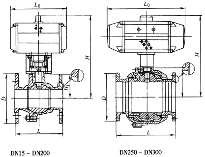 Q641F、Q641Y 型 PN63 氣動球閥主要外形及結構尺寸(mm)