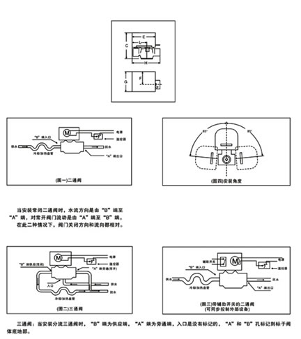 1、常閉二通閥和分流三通閥的安裝如圖一、圖二及圖三所示。