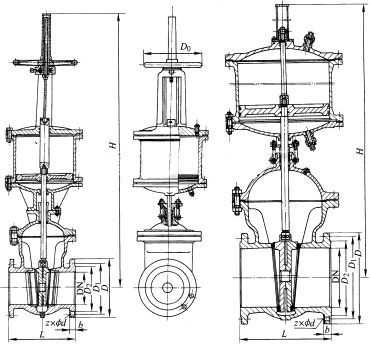 Z6s41H、Z6s41Y、Z6s41F 型 PN40 氣動帶手動楔式閘閥主要外形及結(jié)構尺寸(mm)