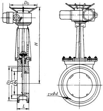 PZ973H、PZ973F、PZ973Y (PN16) 型電動刀型閘閥(刀閘閥)外形及結(jié)構(gòu)尺寸 (mm)